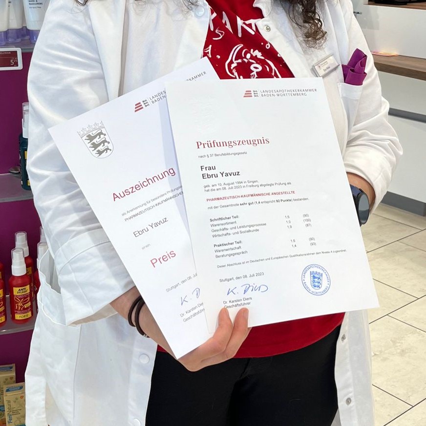 Hurra – unsere Auszubildende Ebru Yavuz hat ihre Ausbildung zur Pharm.-Kaufm.-Angestellten mit der Traumnote 1,4 und einer Auszeichnung abgeschlossen. Sie ist die beste weibliche PKA in Baden-Württemberg! Eine Einladung zur Landes-Apothekerkammer Baden-Württemberg nach Stuttgart wird die Auszeichnung abrunden.