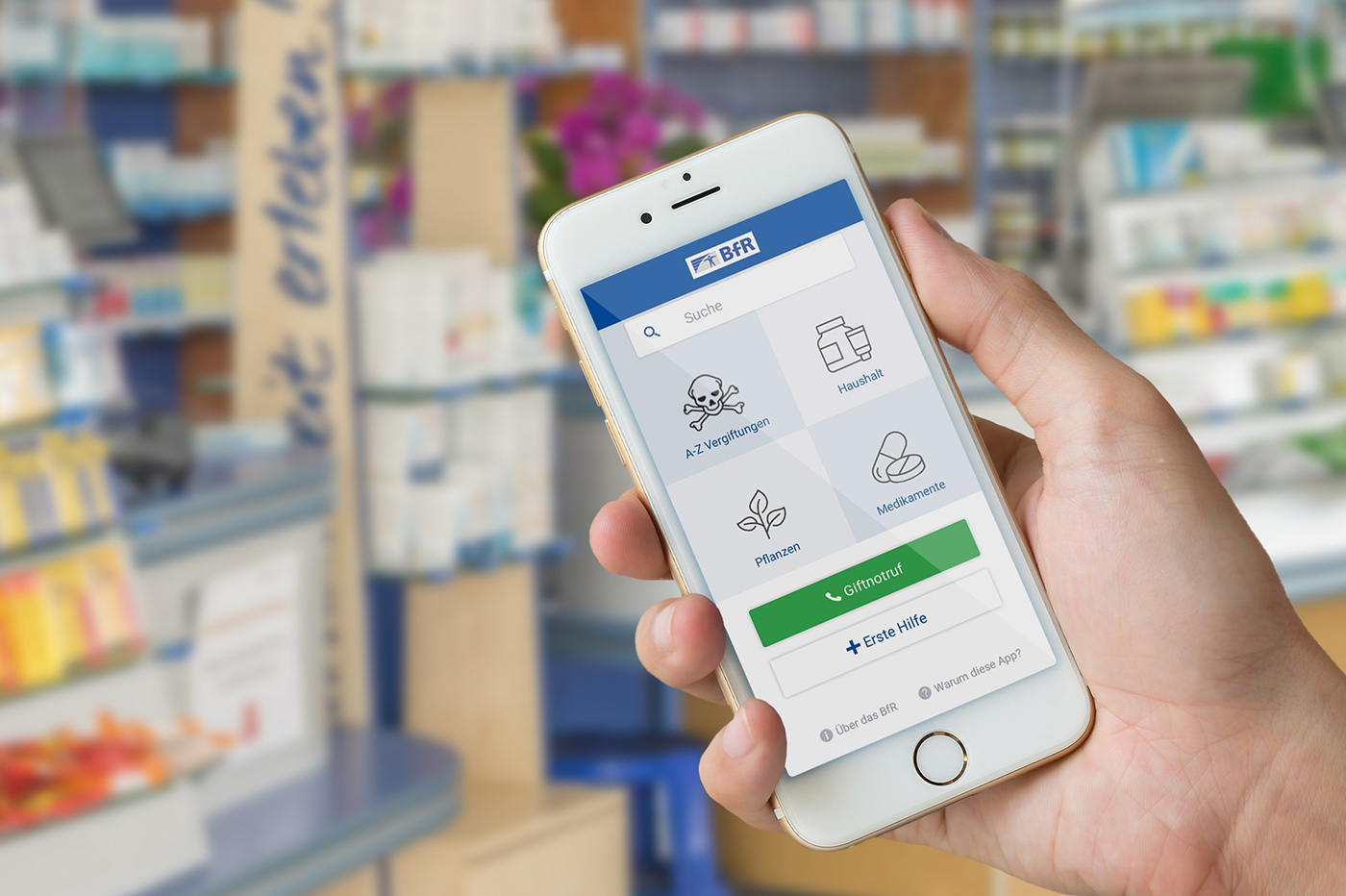 Die BfR-App gibt Informationen über Erste-Hilfe-Maßnahmen im Vergiftungsfall und allgemeine Maßnahmen für die Erste Hilfe. Im Ernstfall kann sie ärztliche Beratung, besonders in Vergiftungszentren, nicht ersetzen.