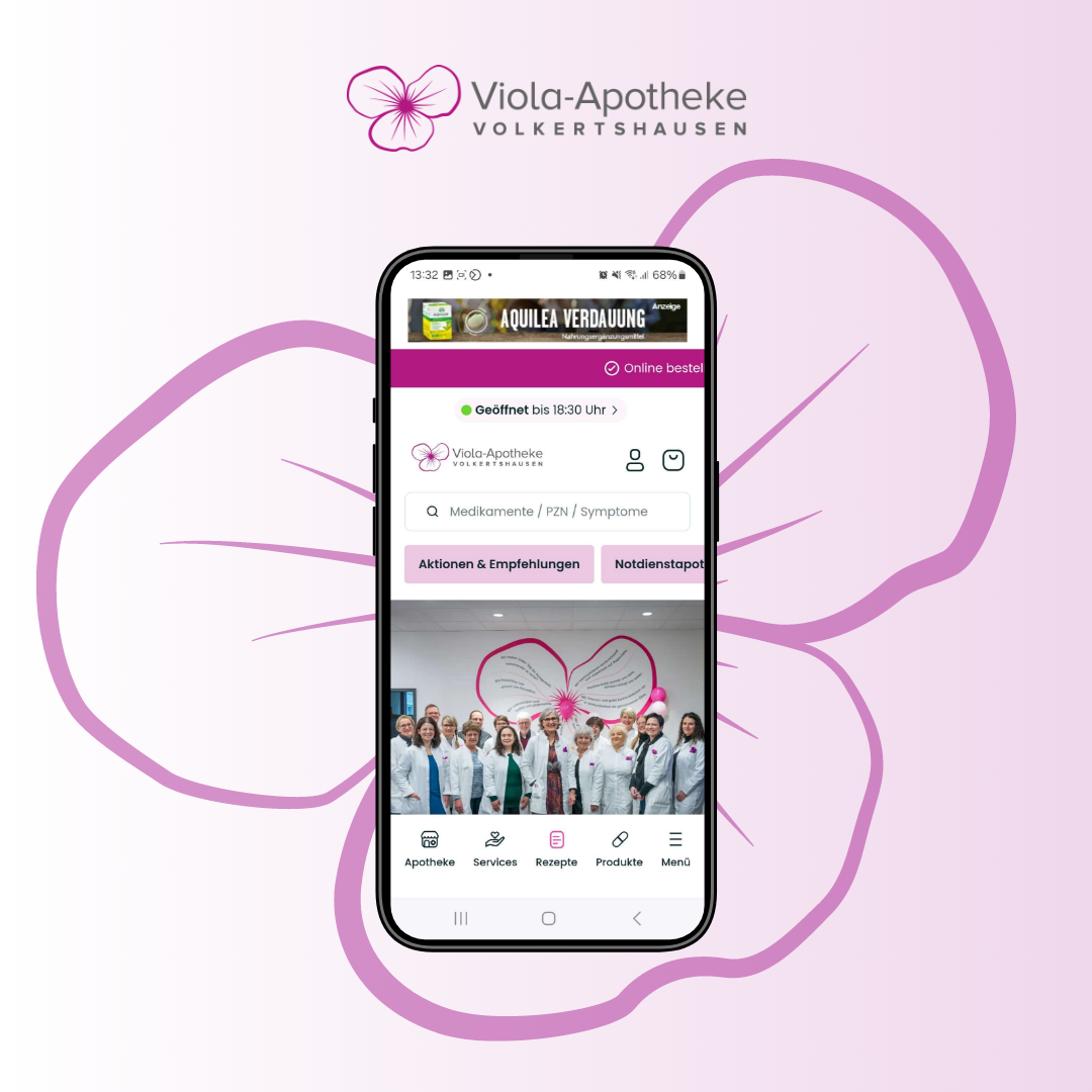 Endlich da! Die neue apotheke.com App ist jetzt im App Store und bei Google Play verfügbar! Holen Sie sich jetzt Ihre persönliche Gesundheitsversorgung direkt aufs Handy – einfach downloaden, die Viola-Apotheke Volkertshausen als Stammapotheke festlegen, loslegen und gesund bleiben!