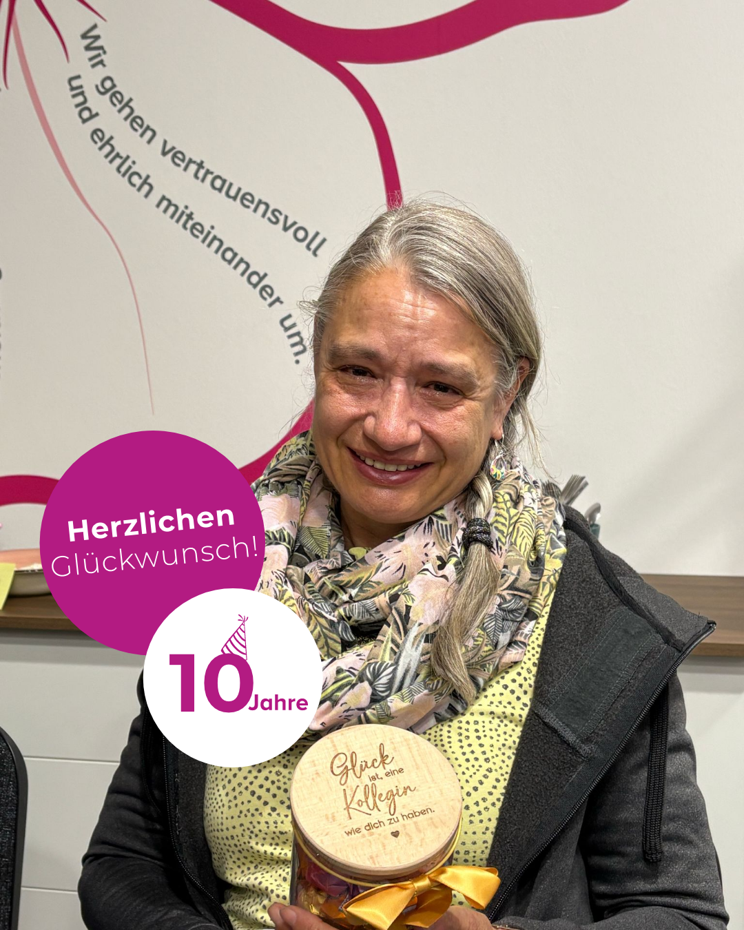 Am 1.9.1994 begann sie als Pharm.-Kaufm.-Angestellte in der ehemaligen Aachtal-Apotheke und blieb auch nach der Übernahme durch Stéphanie Haas-Komp der Viola-Apotheke Volkertshausen erhalten. Ihre freundliche und unaufgeregte Art, ihre ruhige und zugewandte Stimme ist vielen KundInnen und PatientInnen am Telefon sehr vertraut und in der Viola-Apotheke Volkertshausen ein stabiler Pfeiler. Stéphanie Haas-Komp gratuliert (wenn auch in „retardierter“ Form) sehr herzlich mit dem gesamten Team, bedankt sich für die gute Zusammenarbeit und wünscht noch viele aktive und gesunde Jahre in der Viola-Apotheke Volkertshausen.