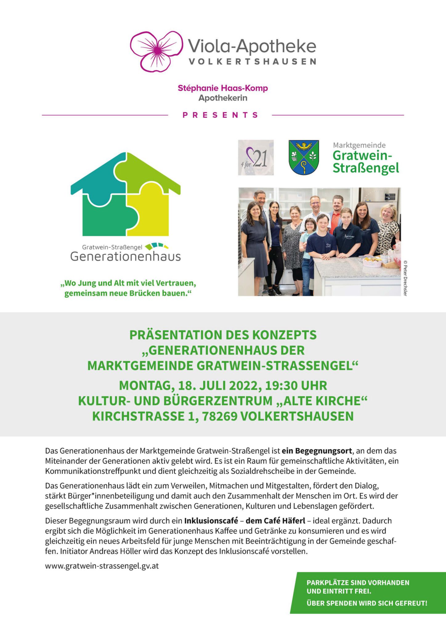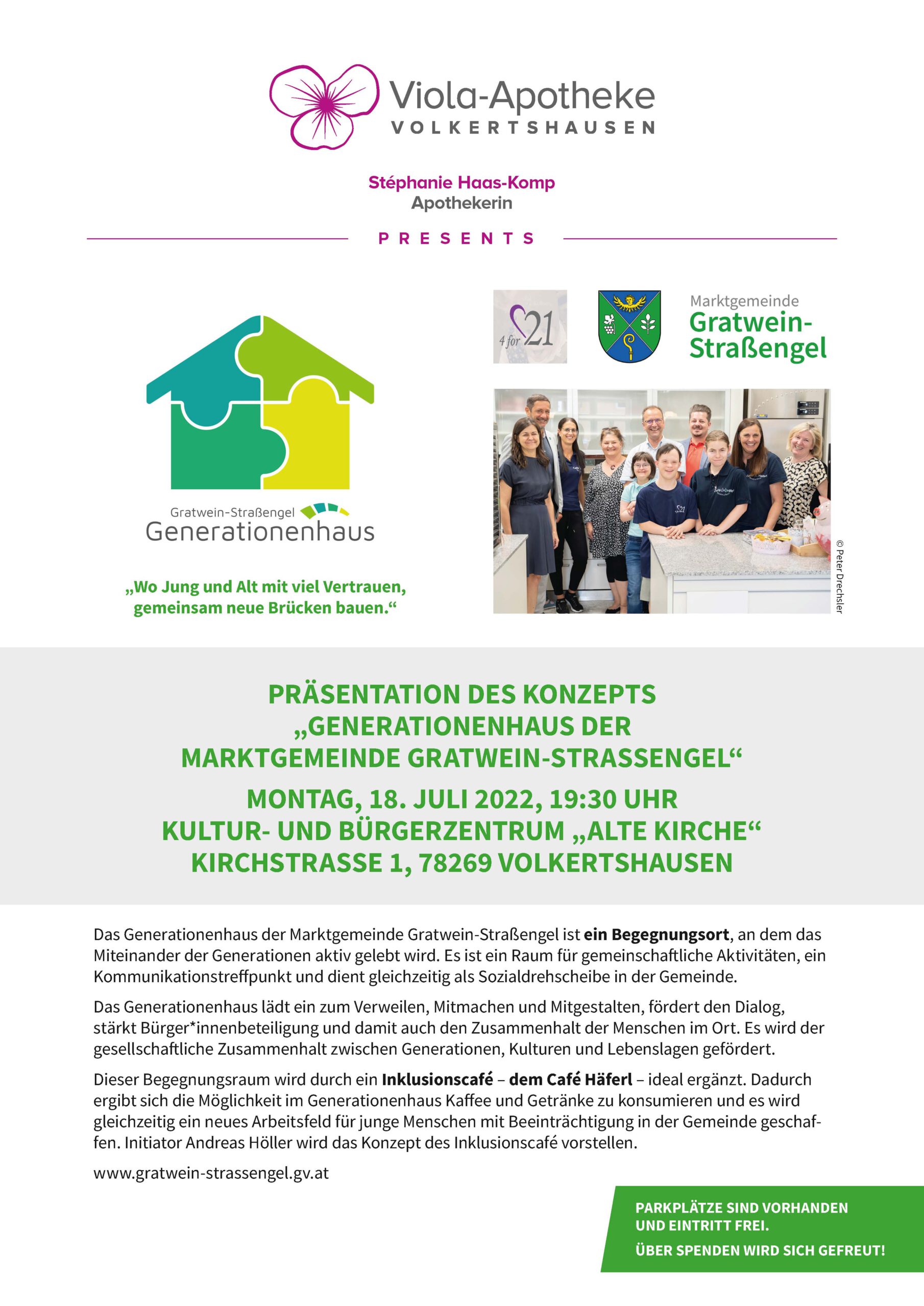 Das Generationenhaus der Marktgemeinde Gratwein-Straßengel ist ein Begegnungsort, an dem das Miteinander der Generationen aktiv gelebt wird. Es ist ein Raum für gemeinschaftliche Aktivitäten, ein Kommunikationstreffpunkt und dient gleichzeitig als Sozialdrehscheibe in der Gemeinde.