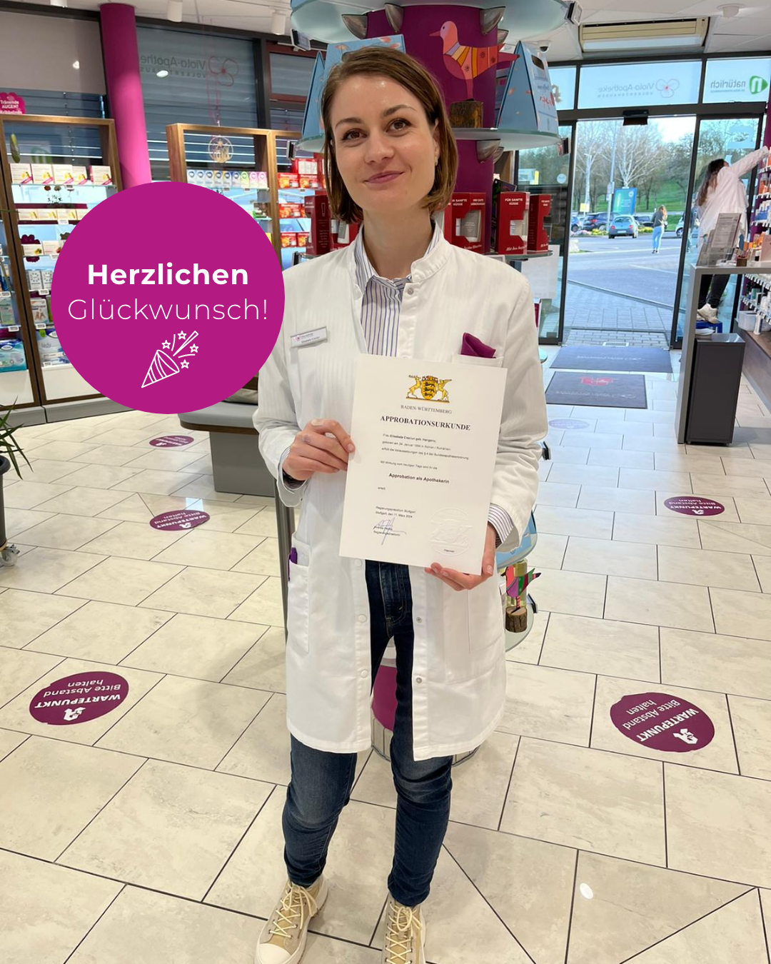 Nach 16 Monaten mit viel Lernen der deutschen Sprache und Erlernen der unterschiedlichen Arbeitsweisen in einer deutschen Apotheke darf Frau Craciun nun auch als approbierte Apothekerin in deutschen Apotheken arbeiten. Das ganze Team der Viola-Apotheke Volkertshausen hat Frau Craciun intensiv begleitet, unterstützt und ihr die Möglichkeit gegeben, die „Apothekerei“ in Deutschland kennenzulernen.